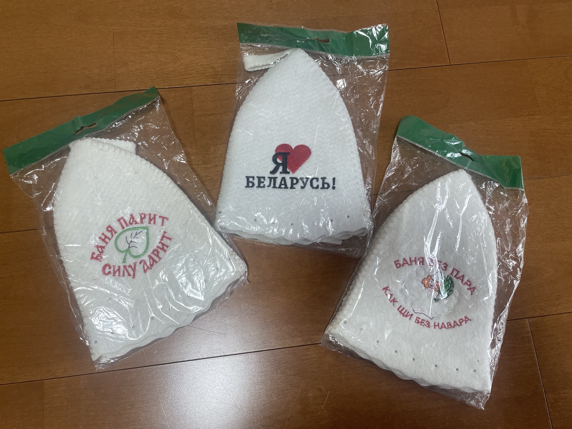 ベラルーシのサウナハットは、ウールやフェルト素材で作られ、可愛い刺繍やイラストが入ったものも多く、使うだけで気分が上がります。私は3つで2,000円ほどで購入しましたが、店員さんの粋なサービスで1つおまけしてくれ、計4つになりました。